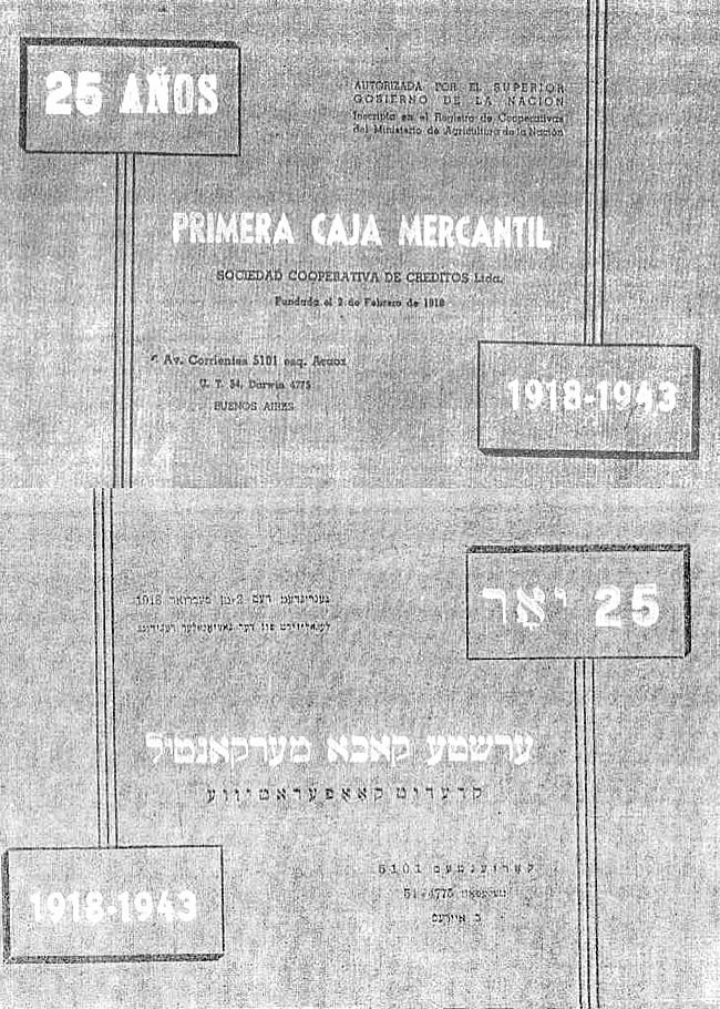 Tapa (en idish) y contratapa (en castellano) del folleto publicado por la Primera Caja mercantil para conmemorar el 25 aniversario de su fundación (1943). Ver en Biblioteca el tecto completo.
